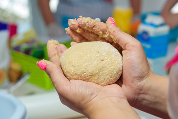 Hands kneading dough for homemade bread preparation