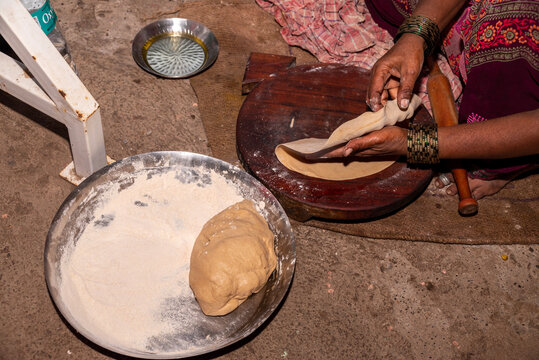 A village woman makes bread on the stove. cooking bread in clay stove , chula , makeing bread , roti , in village