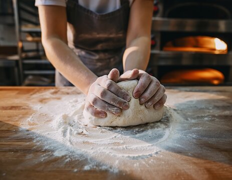 Woman hands knead raw dough on flour dusted wooden table. Baker prepares bread mixture in rustic kitchen, creating artisan food. Flour sprinkled surface and soft light.