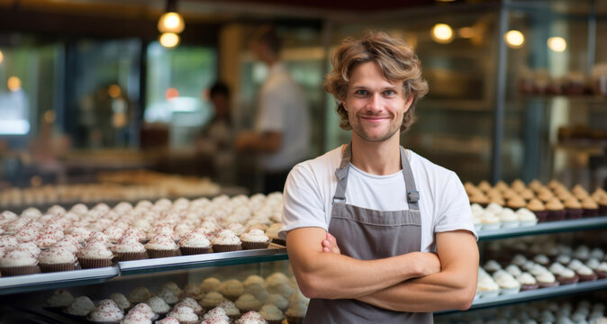 Male shop assistant demonstrating fresh delicious pastry in bakery