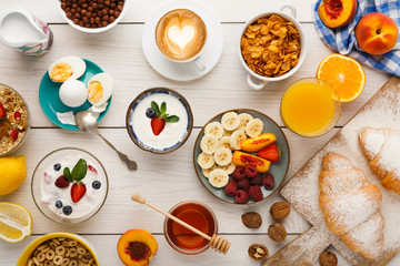 Baking background. Cooking ingredients for dough, eggs, flour, sugar, butter, rolling pin on white style kitchen. Copy space. Banner, crop