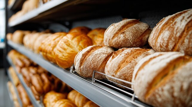 Rows of freshly baked bread loaves on metal shelves in commercial bakery setting with warm lighting
