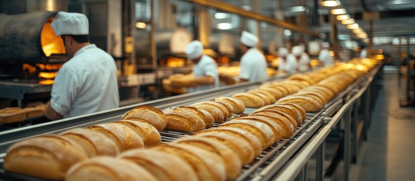 Hygienic bakery manufacturing facility, workers in gloves handling fresh bread, automated dough processing ensuring cleanliness and precision