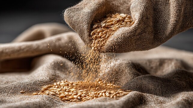 Hand pouring wheat grains harvest Grains being poured onto a textured fabric surface.
