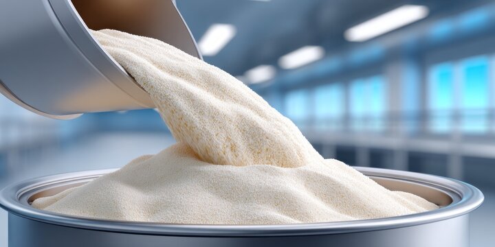 Close-Up View of Flour Pouring from Container in Modern Milling Production Line