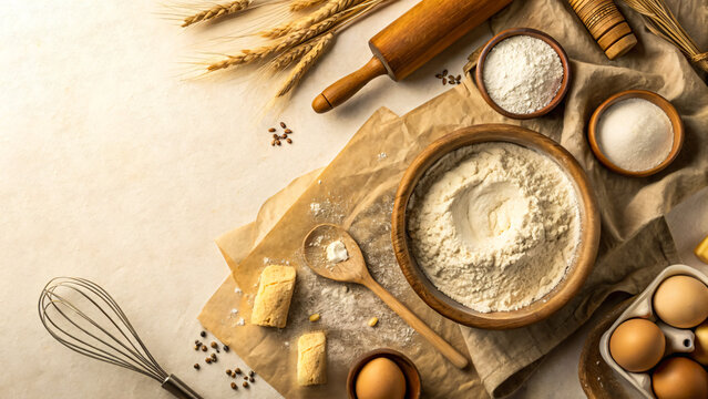 Flour baking ingredient white powder background texture cooking food panorama gentle flour baking ingredient on white powder background texture in soft light panorama for culinary design