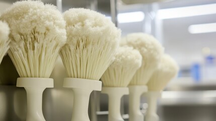A row of heavy duty cleaning brushes with stiff white bristles arranged in a line
