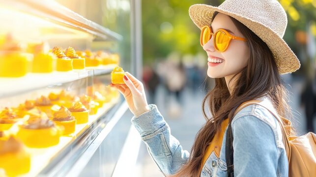 Delightful moment as a couple enjoys selecting desserts at a charming bakery during a lively afternoon visit together