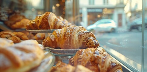 Delicious croissants in the window of an Italian bakery with city view