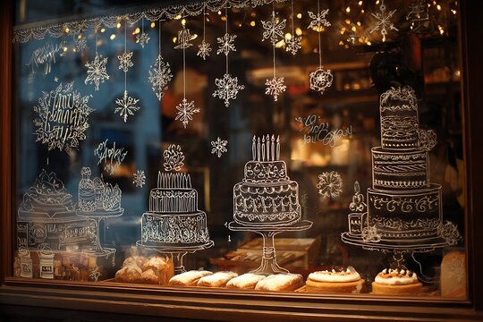 A festive bakery window display featuring chalk art of cakes and snowflakes, showcasing delicious pastries and creating a warm, inviting atmosphere.