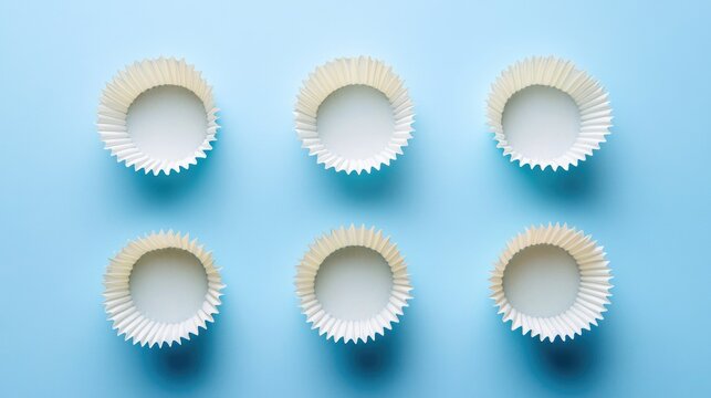 Cupcake and muffin baking cups arranged in a flat lay on a vibrant blue background, showcasing six white paper liners with frilled edges.