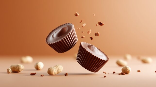 Two Reese's cups with peanut shells on the ground. One of the cups is open. The other cup is closed