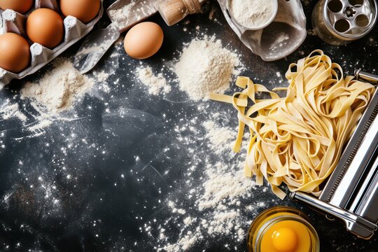Top view of a homemade pasta machine and the ingredients for making pasta like eggs and flour.