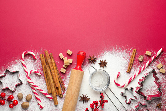 Candy canes, ingredients and utensils for baking cookies on red background, flat lay with space for text. Christmas season