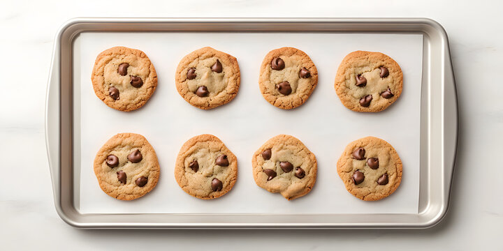 Golden brown chocolate chip cookies freshly baked on a baking sheet. Perfect for a sweet treat or snack.