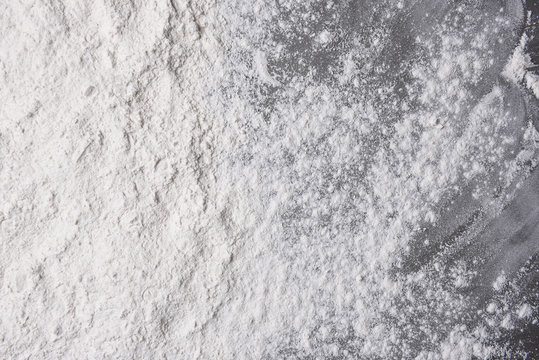 Rolled out white roll of baking paper on light blue table background. Pastel color. Closeup. Empty place for text. Top down view.