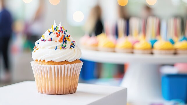 Colorful cupcake decorating station with white frosted cupcakes at a kids birthday party celebration