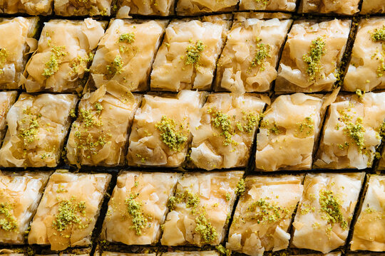 Baklava varieties on dessert store. Turkish baklava on tray. Traditional Baklava from Gaziantep, Turkey. Baklava with pistachio.