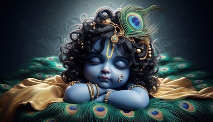 Lord Krishna Bal Gopal Laddu Gopal n God Divine Religion Hinduism Spirituality Faith Belief Culture Tradition Blue Background Flowers Decorated