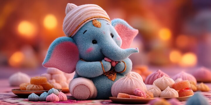 Bal Ganapati, the child form of Ganesha, playing with sweets (modaks), warm and joyful atmosphere, cute mood