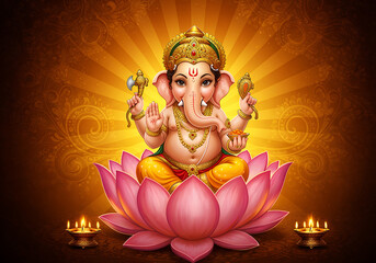 Smiling Bal Ganapati Sitting on Lotus Flower with Warm Radiant Background and Decorative Floral Patterns