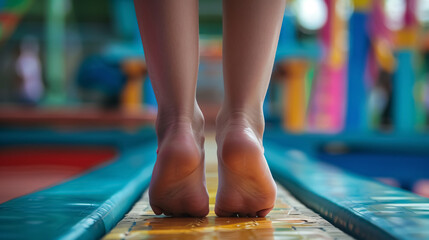 Feet of Gymnast on Balance Beam: Close-up of balance beam performance.
