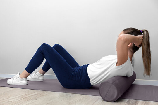 Woman practicing mindful meditation and yoga near stability balls in bright wellness studio