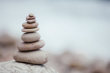Balanced pile of smooth rocks on pebble beach