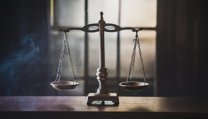 Old fashioned balance scale against dark smoky backdrop. Beautiful mystical magic equilibrium.