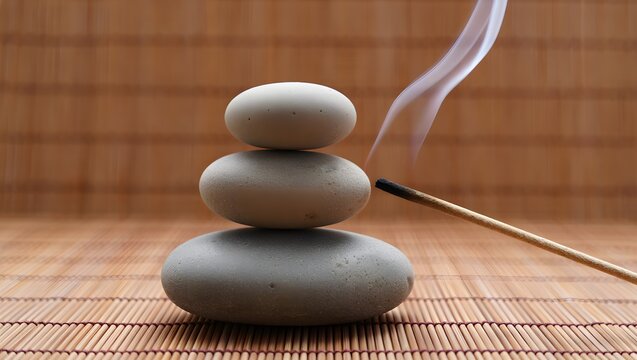 Balanced spa pebbles on wooden surface creating tranquil ambiance
