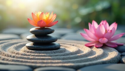 Close-up of smooth stones placed in a Zen garden. Delicate patterns are raked into the fine sand, bathed in soft light