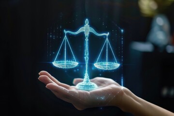 Scales hold green plants, balancing nature, city. Climate justice concept. Weight scales as law symbol, equality between ecology, industry. Eco balance, sustainable future, clean environment.