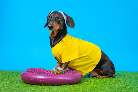 Dog fitness for dog balance exercises Dachshund in sports uniform, headband , wristbands on paws, stands on round massage disk, trains, looks purposefully, poses Physical development of pet, handling