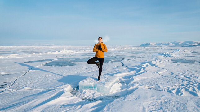 Woman practicing yoga balance pose on ice floe in frozen landscape