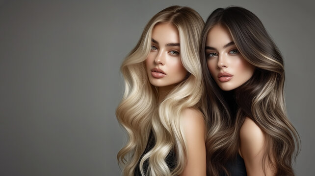 Two beautiful woman with hair coloring in ultra blond and balayage , hair coloring technique . Stylish hairstyle curls done in a beauty salon. Fashion, cosmetics and makeup