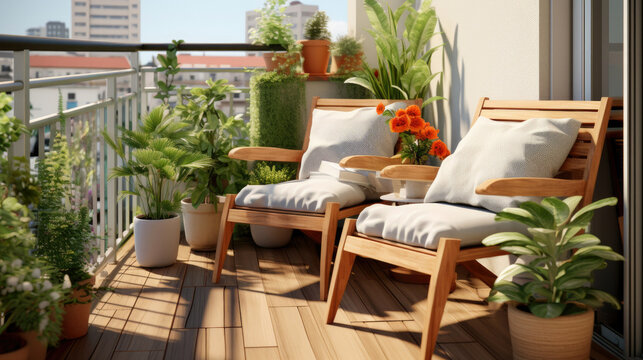 Beautiful balcony or terrace with wooden floor, chair and green potted flowers plants. Cozy relaxing area at home. Sunny stylish balcony terrace in the city