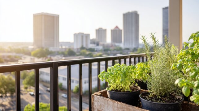 Potted herbs and greens on sunny high-rise balcony with cityscape background. Urban gardening setup with fresh aromatic plants thriving