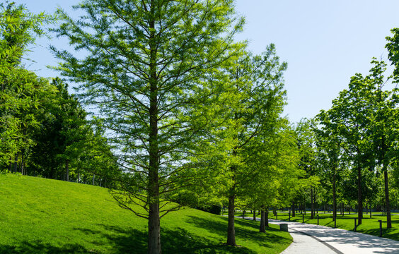 Alley of Bald Cypress Taxodium Distichum (swamp, white-cypress, gulf or tidewater red cypress) in public landscape city Park Krasnodar or 'Galitsky park' in sunny spring 2021.