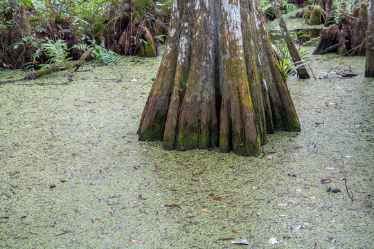 A base of the trunk of a bald cypress tree, part of the root system in a duckweed filled water of the swamp, Audubon Corkscrew Sanctuary, Florida