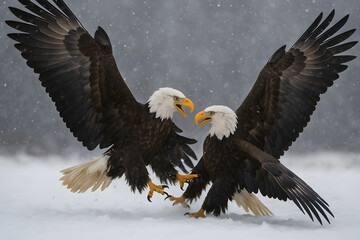 Two majestic bald eagles in a dynamic confrontation over icy waters