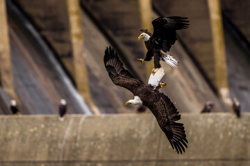 Soaring golden eagle sculpture gliding through sun halo over blue sky and clouds
