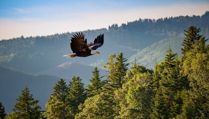 bald eagle flying majestically over forested hills with visible