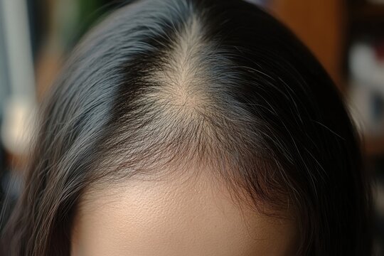 Hair loss problem: An Asian woman examines her scalp with concern, noticing thinning hair and potential balding spots, Generative AI