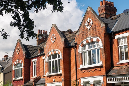 Row of restored Victorian house in red bricks and white finishing on a local street in Clapham, South London, UK