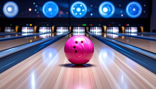 Pink bowling ball centered on polished lane—symmetrical depth and cool lighting for sporty drama.