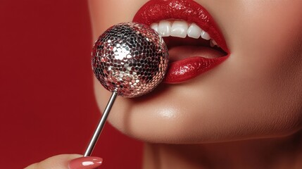 A woman's deep-red lips frame a dazzling silver disco ball at her smile's center, its facets shimmering like countless mirrors in perfect alignment