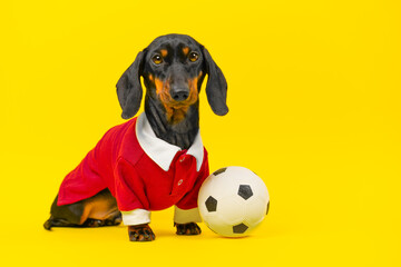Cute puppy in red uniform sits next to ball on yellow background, kid football player. Soccer training at an elite school, competition among children Advertising active group training handler, agility