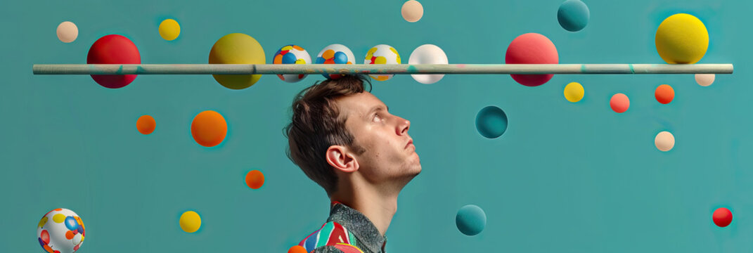 A man balances a long, thin pole vertically on his chin, a line of colorful balls perched atop it, while simultaneously juggling two more balls.