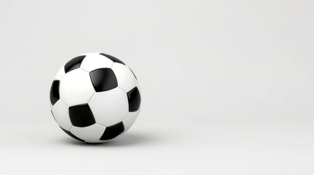 Soccer ball, football. Banner composition. classic black and white soccer ball (football) is positioned on the left side of the frame, resting on a plain, light grey surface