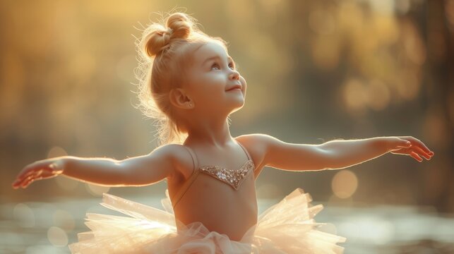 A young girl in a ballerina costume, wearing a tutu, poses with her arms outstretched in a sunny outdoor setting.